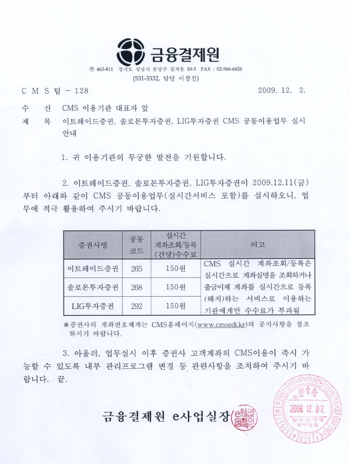 - 이트레이드증권, 솔로몬투자증권, LIG투자증권 CMS 업무 실시 안내
