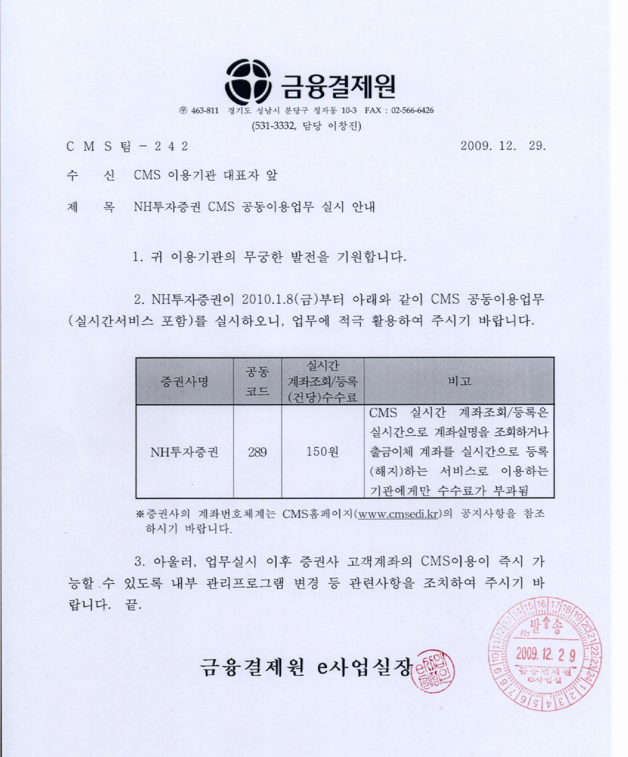 - NH투자증권 CMS 공동이용업무 실시 안내